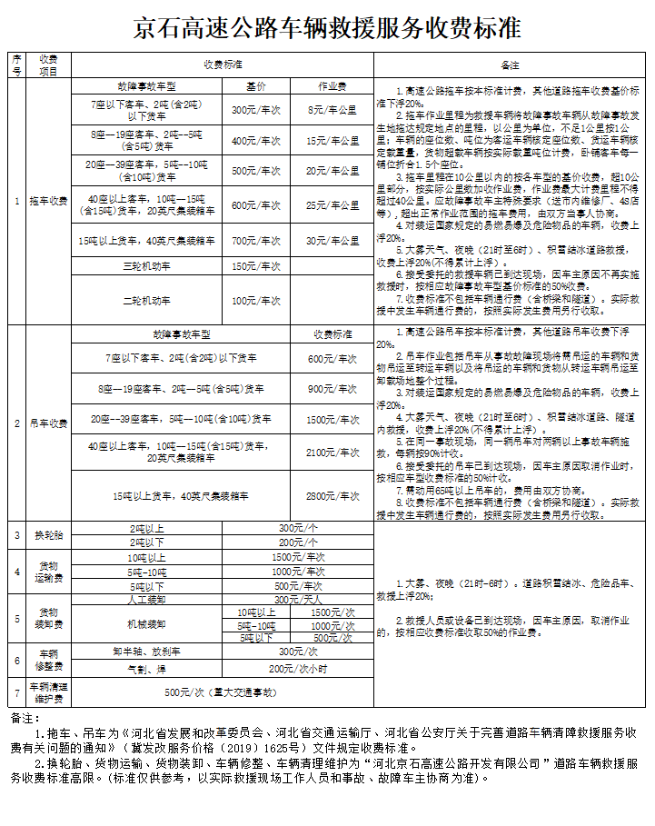 河北京石高速公路開發(fā)有限公司車輛救援服務信息公示表