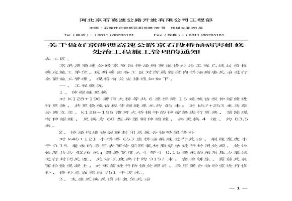 關(guān)于做好京港澳高速公路京石段橋涵病害維修處治工程施工管理的通知