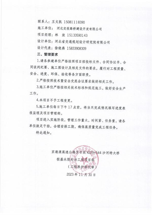 關(guān)于做好京港澳高速公路京石段K229+544沙河特大橋樁基水毀處治工程項目管理的通知