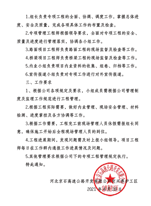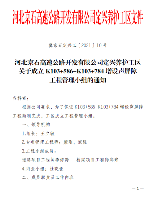 河北京石高速公路開發(fā)有限公司定興養(yǎng)護工區(qū)關于成立K103 586_K103 784增設聲屏障工程管理小組的通知