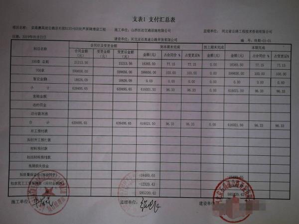 京港澳高速公路京石段K130+600處聲屏障增設(shè)工程支付證書(shū)