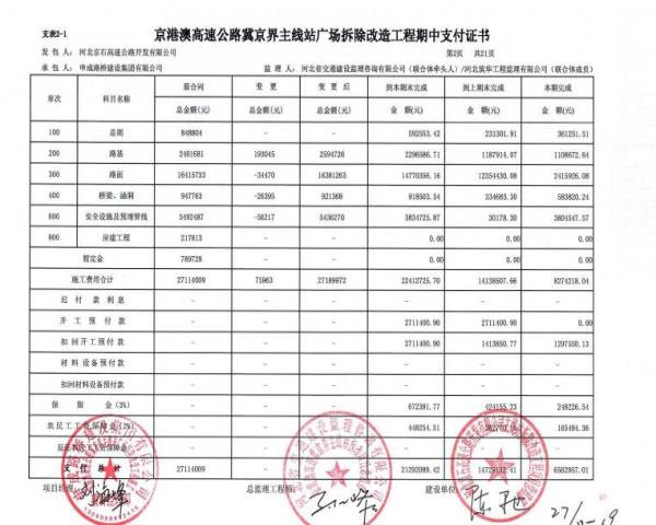 京港澳高速公路冀京界主線站廣場(chǎng)拆除改造工程期中支付證書(shū)