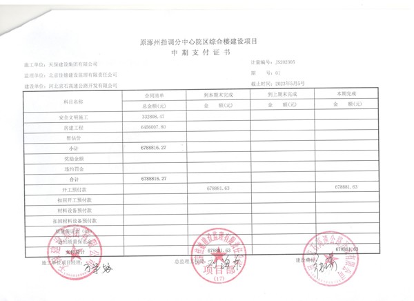 原涿州指調(diào)分中心院區(qū)綜合樓建設(shè)項目支付證書