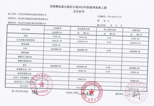 京港澳高速公路京石段2023年防眩網(wǎng)更換工程支付證書(shū)
