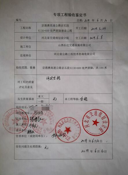 京港澳高速公路京石段K130+600處聲屏障增設(shè)工程專項工程鑒定書