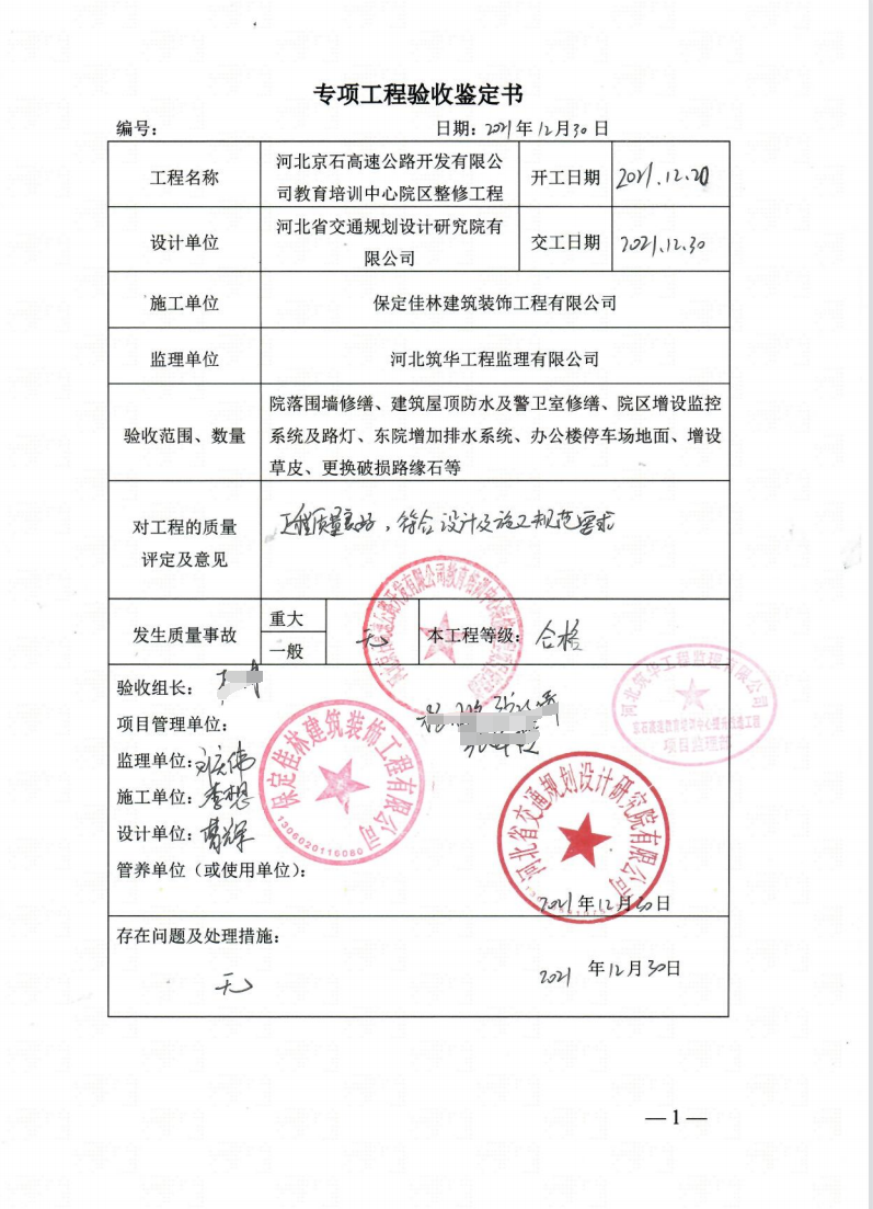 河北京石高速公路開發(fā)有限公司教育培訓中心院區(qū)整修工程竣工驗收