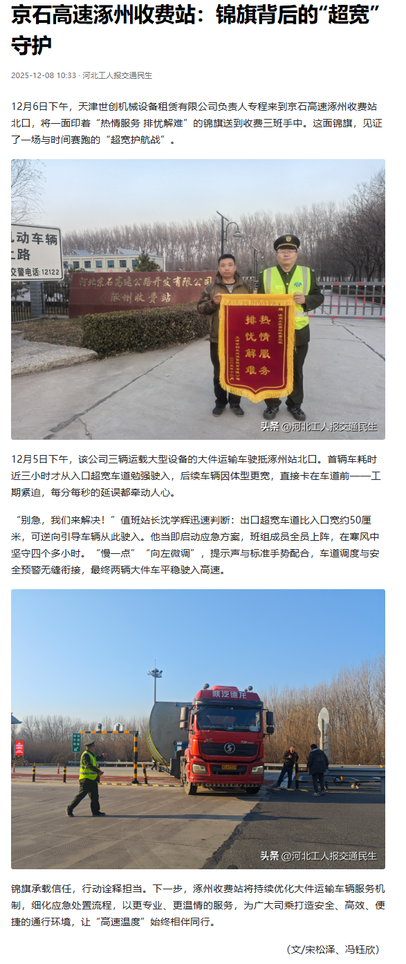 京石高速涿州收費(fèi)站:錦旗背后的“超寬”守護(hù)