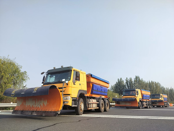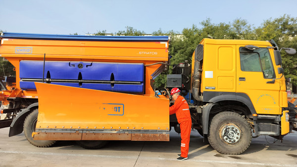 演練現(xiàn)場(chǎng),除雪車、液體融雪劑撒布車、小型撒布機(jī)、巡查車等機(jī)械車輛整齊排列,蓄勢(shì)待發(fā);應(yīng)急人員橘黃養(yǎng)護(hù)服,頭戴安全帽,精神抖擻,全部進(jìn)入待命狀態(tài)。
