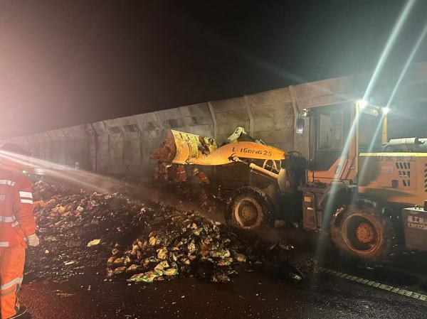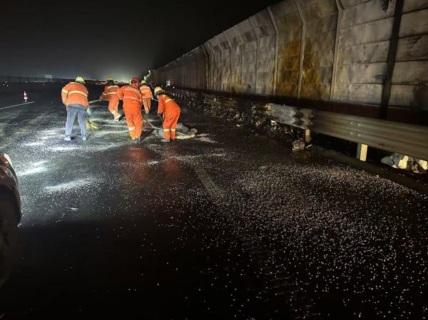 現(xiàn)場作業(yè)人員爭分奪秒地對事故現(xiàn)場進行清理和救援。清障救援隊利用專業(yè)設備,將受損車輛快速拖離現(xiàn)場,工區(qū)作業(yè)人員利用大型機械清理路面上的散落物,同時為防止路面結(jié)冰,在清理后的事故路段撒布了融雪劑。經(jīng)過近三個小時緊張有序的奮戰(zhàn),事故現(xiàn)場的散落物終于被清理干凈,路面恢復了正常通行。