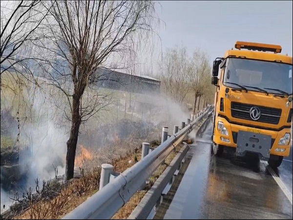 火情就是命令,巡查人員迅速做出反應(yīng),采取應(yīng)急措施,即刻兵分兩路。其中一組迅速將巡查車(chē)后移,在上游位置打開(kāi)警報(bào)器、警示燈,警示車(chē)輛減速謹(jǐn)慎通過(guò);另一組迅速取用隨車(chē)滅火工具展開(kāi)撲救。因火勢(shì)過(guò)猛,人工滅火難以控制,工區(qū)緊急抽調(diào)附近正在進(jìn)行綠化澆水作業(yè)的水車(chē)前來(lái)支援。經(jīng)過(guò)近30分鐘全力撲救,火情被撲滅,保障了過(guò)往車(chē)輛安全通行。