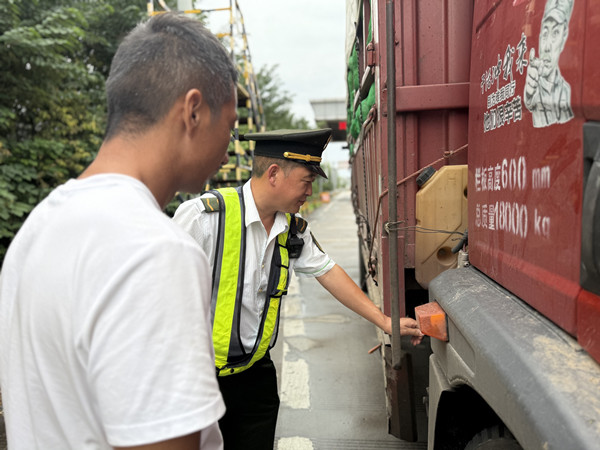當班工作人員發(fā)現(xiàn)異常后,第一時間上前詢問情況并提供幫助,工作人員一邊協(xié)助司機在車輛后方安全距離處擺放警示錐,提醒過往車輛減速避讓,一邊安排工作人員進行疏導,避免發(fā)生事故。