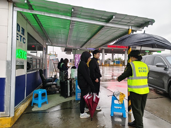 返程大軍中,一群正在等候返校大巴的學(xué)生格外引人注目。由于班車尚未抵達,他們只能在雨中焦急等待,衣衫漸漸被雨水打濕。收費站工作人員發(fā)現(xiàn)后,立即上前招呼:"同學(xué)們,先到這邊來避避雨!"學(xué)生們被引導(dǎo)至"愛心驛站"的遮雨棚下,這個臨時的避風港,不僅為學(xué)子們擋住了風雨,更讓他們在漫長的返校路上,收獲了一份意外的溫暖。