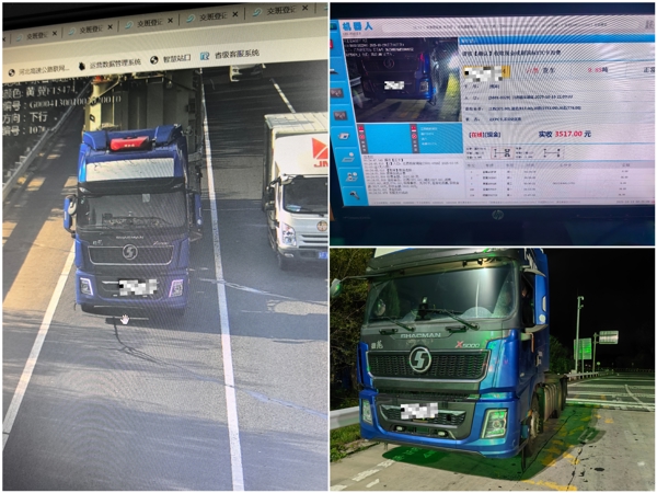 10月19日凌晨0時25分,一輛冀F牌照三軸牽引車緩緩駛?cè)虢】党鞘召M站出口7道。車輛接受常規(guī)核驗時,當班工作人員發(fā)現(xiàn)該車僅有車頭,且持ETC卡通行時,收費系統(tǒng)提示“無入口信息”。這一異常情況立即引起工作人員警覺,隨即對該車展開詳細核查。
