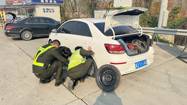 11月4日,京石高速定興收費站口,一輛白色轎車駛出收費車道時,左后輪胎已然癟氣。值班工作人員第一時間示意司機??堪踩恢?,并迅速展開檢查。