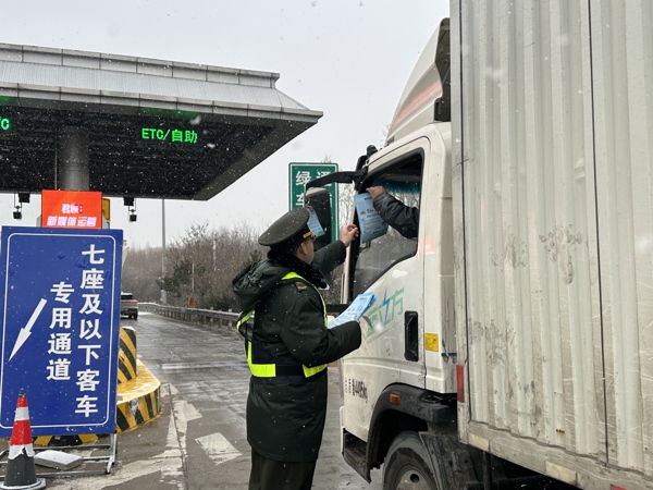 收費員利用車輛通行間隙,主動提醒過往車輛注意雪天路滑、減速慢行。同時,向司乘人員發(fā)放雪天行車安全宣傳單,并提供印有冬季行車注意事項的實用濕巾,幫助駕駛員提升安全意識。