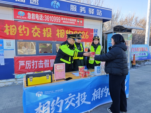天氣雖然寒冷,站口卻暖意融融?!跋嗉s交投·相約2026”主題橫幅掛在顯眼處,洋溢著向新向上的新年氣象。工作人員身著整齊工裝,笑容親切,一邊耐心講解“冀交萬里行”積分使用規(guī)則以及新年優(yōu)惠活動(dòng),邀請司乘加入會(huì)員暢享更多出行服務(wù);一邊將一杯暖姜茶、一次貼心指路、一件觸手可及的便民工具,化作實(shí)實(shí)在在的溫暖,連同真摯的新年祝福,親手遞送給過往司乘。