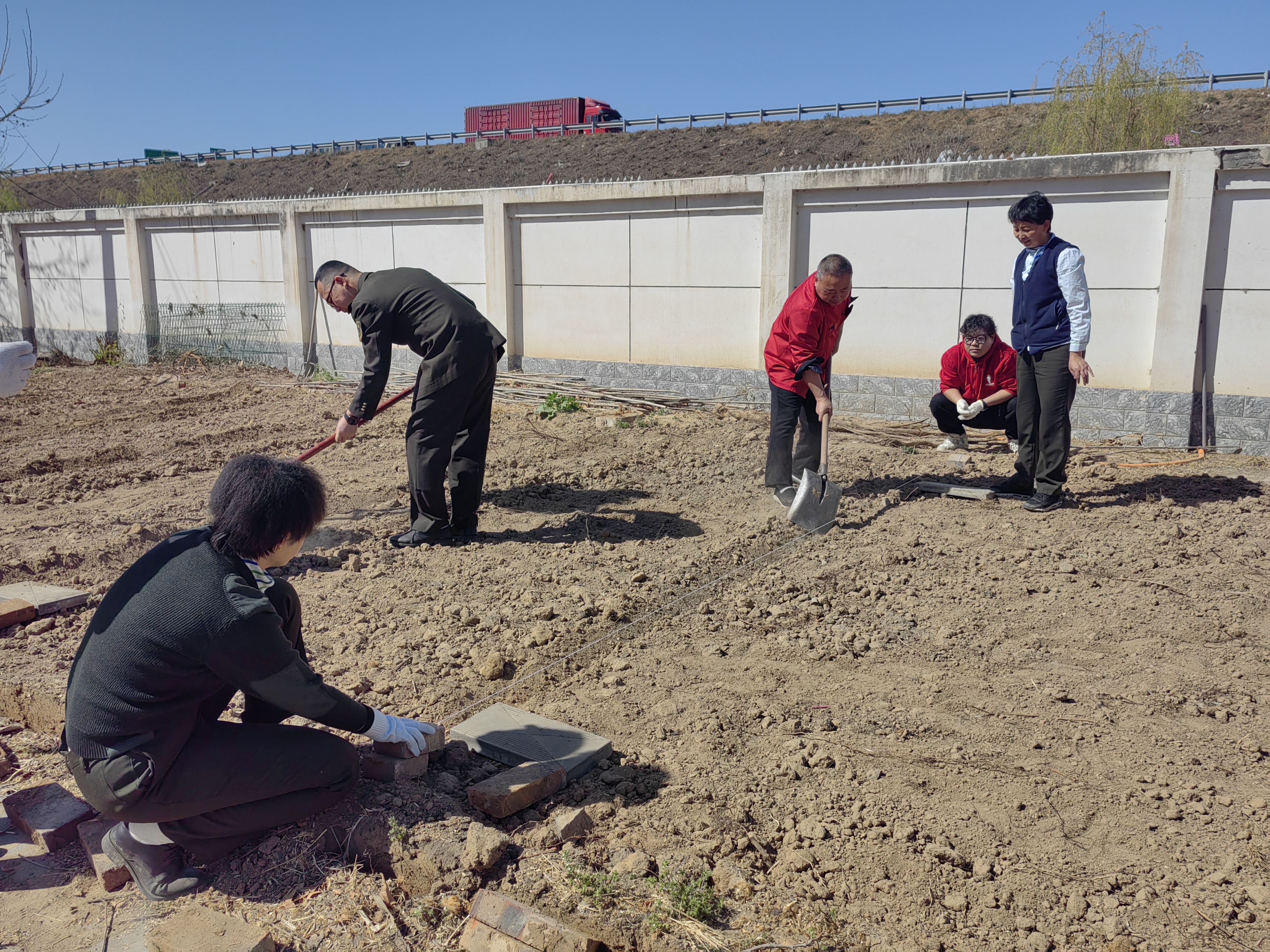 在鋪磚環(huán)節(jié),大家集思廣益,雖然不是專業(yè)的,但是在這個(gè)網(wǎng)絡(luò)發(fā)達(dá)的時(shí)代,大家對(duì)照手機(jī)里的教學(xué)視頻,將每塊磚錯(cuò)縫排列,既能防止雜草滋生,又形成自然的導(dǎo)水槽。站長(zhǎng)劉淑芳帶著“徒弟們”用棉線拉出筆直的基準(zhǔn)線,食堂“資深”的蘇師傅手持橡膠錘反復(fù)敲打校正,磚縫誤差嚴(yán)格控制在3毫米內(nèi)。新入職的昕瑤邊鋪磚邊贊嘆:“這手藝太牛了?!币帽娙斯笮?。大家干得熱火朝天,汗水浸透了衣服,也不知疲倦,仿佛閃念間看到了不久后菜園里豐收的場(chǎng)景。