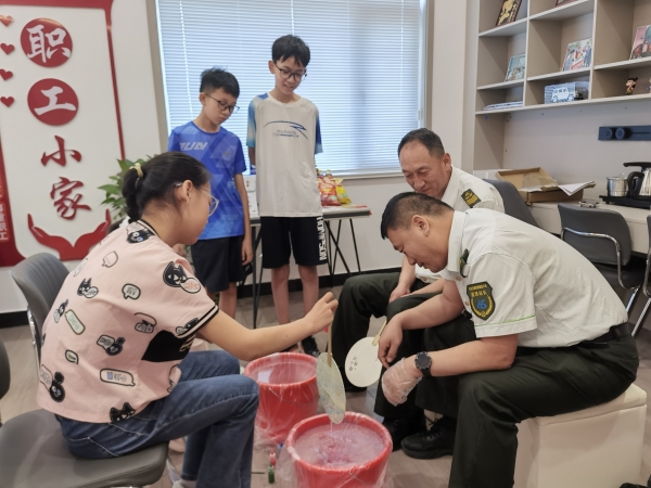 親子創(chuàng)作環(huán)節(jié)暖意涌動(dòng)。家長(zhǎng)與孩子并肩協(xié)作,一同調(diào)試漆色、輕漾水面、旋動(dòng)扇面。看色彩在水中暈染成靈動(dòng)的詩,又在扇面上定格成獨(dú)有的景,孩子們眼中滿是驚喜?!鞍职?,瞧我做的扇子!”此刻,手工創(chuàng)作的喜悅與紅色基因的傳承悄然相擁,家長(zhǎng)們?cè)谂惆橹兄販爻跣?,孩子們?cè)趯?shí)踐中埋下信仰的種子。