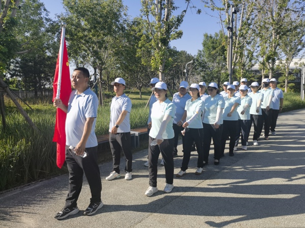 夏日的絲路友誼園綠意盎然,蜿蜒步道如一條銀色紐帶。員工們精神飽滿,步伐矯健,在黨旗的引領(lǐng)下闊步前行。一枚枚胸前閃耀的黨徽,在綠樹碧草的映襯下格外醒目,無聲訴說著對黨的忠誠信仰。