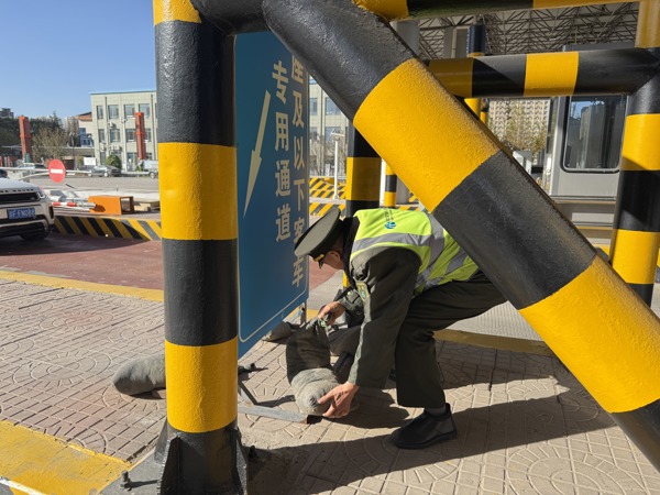 風聲就是命令,安全就是責任。在強風襲來的關鍵時刻,正在崗的工作人員迅速沖出崗亭,逆風奔向車道。他們裹緊衣領,頂著漫天揚沙,逐一檢查車道欄桿的穩(wěn)固情況,確保每一根欄桿都牢牢鎖定。就在這時,路邊通行指示牌已被大風吹倒,工作人員立即上前扶正,并迅速搬來應急沙袋進行加固,一遍遍按壓、一次次確認,直到指示牌穩(wěn)穩(wěn)屹立于狂風之中。